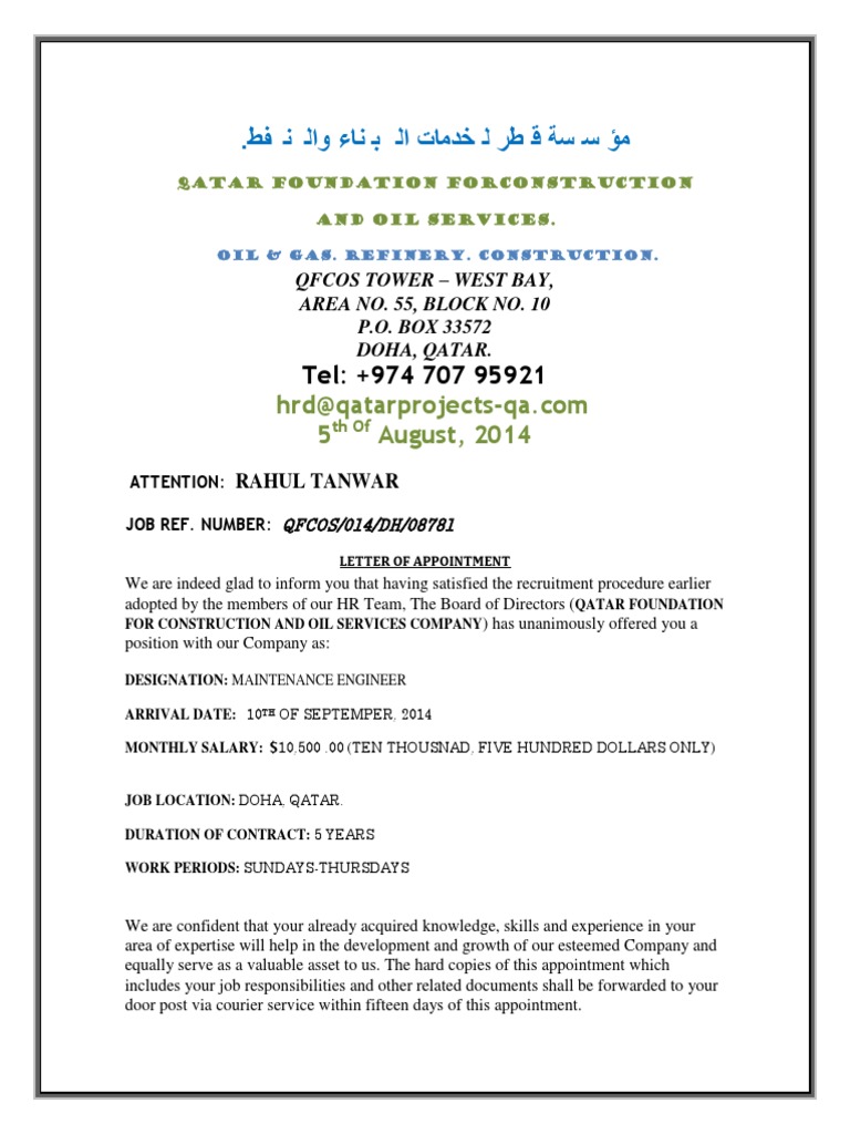 Job Offer Letter Qatar : "job offer from company_name" or "job offer for the position of job_title at company_name") keep the email body text brief and mention that the candidate can find the detailed job offer letter attached.. Do not forget to thank him/her for the offer. A letter, written in english, is needed to apply for an alcohol permit. "job offer from company_name" or "job offer for the position of job_title at company_name") keep the email body text brief and mention that the candidate can find the detailed job offer letter attached. British study centres is a leading international education group. The letter must be addressed to the qatar distribution company, be stamped and signed by an authorised person within the company, and must need these informations 1.